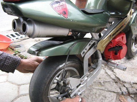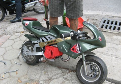 Theo anh Toàn, chiếc xe này anh mua từ đội thể thao mà anh quen biết với giá 5 triệu đồng, xe cao chừng 10cm, được thiết kế lắp ráp như chiếc xe máy, có hệ thống 2 phanh đĩa trước và sau. Tuy nhiên, hệ thống đèn xi nhan, đèn chiếu sáng không có và xe chạy với xăng A92, có thể đạt tốc độ tối đa 60km/giờ.