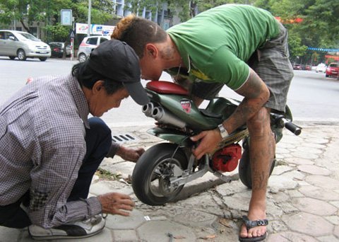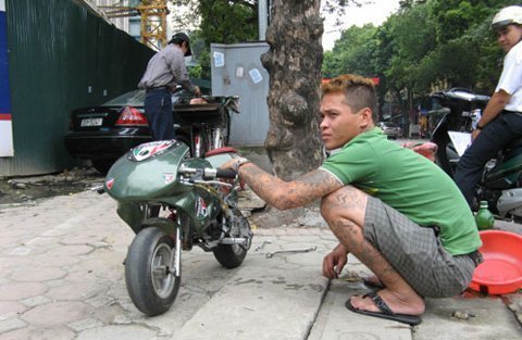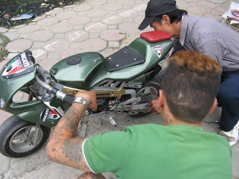 Đuổi theo qua nhiều tuyến phố, PV mới tiếp cận được chủ xe tên là Toàn ở Kim Ngưu. Anh Toàn giới thiệu với PV, tên gọi xe là “xe ruồi” vì tiếng nổ ve ve như ruồi bay, do động cơ được chế từ máy cắt cỏ, xe cũng không có chân trống, đạp nổ mà phải giật bằng dây.